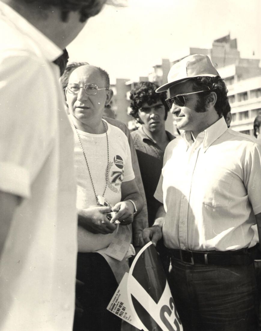 Fot. Robert Szombati (sainz10@googlemail.com) - Węgry; Meta rajdu Złote Piaski - zajęliśmy drugie miejsce w klasyfikacji generalnej. Zwyciężył Antonio Zanini na Porsche. Szybę polewa sowieckim szampanem kierownik polskiej ekipy Jerzy Szymaniak. Z tyłu Sekretarz Generalny Polskiego Związku Motorowego (z białymi włosami, w okularach) inż. Edward Niziołek, obok Andrzej Bielewicz.