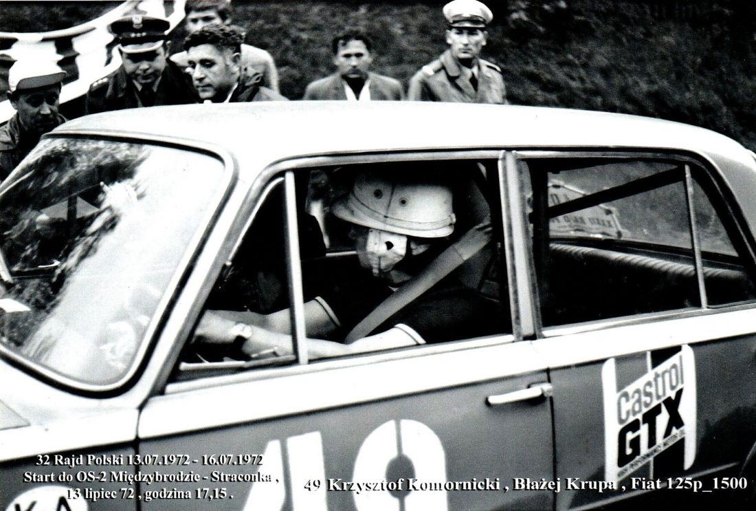 Rajd Polski 1972 z Krzysztofem Komornickim jako kierowcą. Długo nie jechaliśmy w rajdzie ze względu na wydmuchaną uszczelkę pod głowicą, ale zaraz potem pojechaliśmy z Krzysztofem okazją przez pół Polski by obejrzeć naszych konkurentów na odcinku Idzików – Sienna. W 2022 roku spotkałem Waltera Rohrla za kierownicą Forda Capri w historycznym Rajdzie Wiesbaden i opowiedziałem mu tę historię.