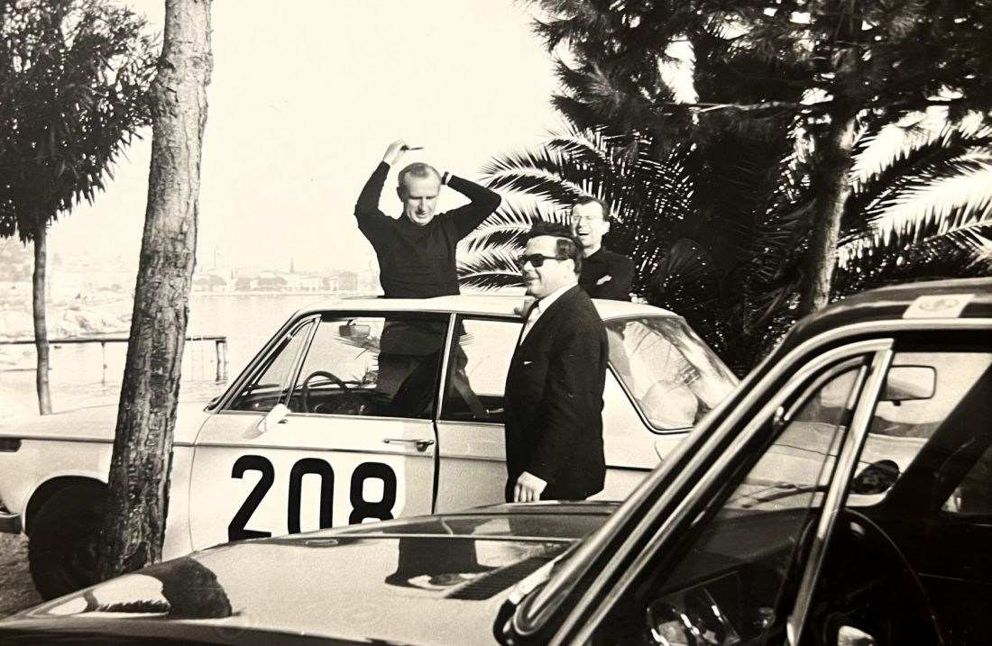 Na zdjęciu od lewej: Jan Karel, Henryk Ruciński, Adam Wędrychowski, Antoni Weiner ( w ciemnych okularach) . BMW 1600TI nr startowy 208 załogi Ruciński/Wędrychowski.