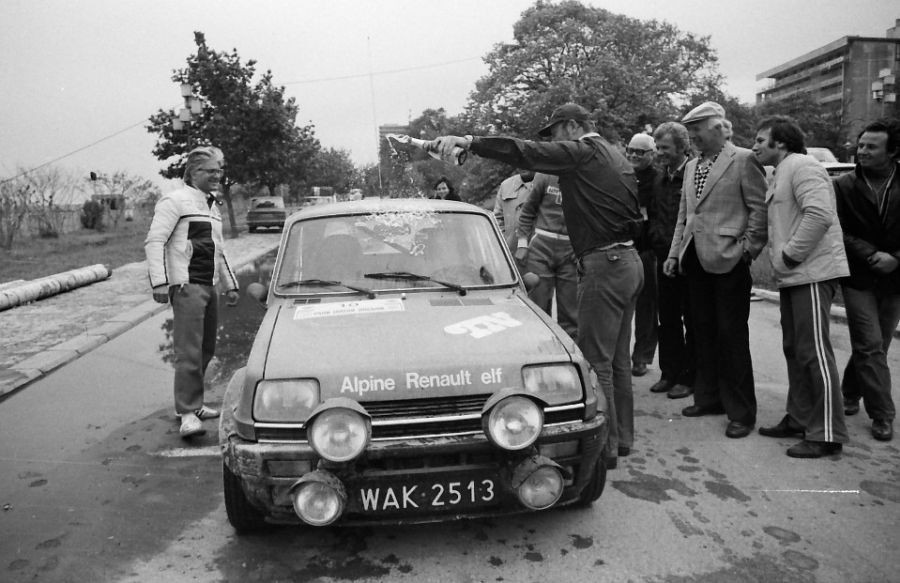Fot. Robert Szombati (sainz10@googlemail.com) - Węgry; Meta rajdu Złote Piaski - zajęliśmy drugie miejsce w klasyfikacji generalnej. Zwyciężył Antonio Zanini na Porsche. Szybę polewa sowieckim szampanem kierownik polskiej ekipy Jerzy Szymaniak. Z tyłu Sekretarz Generalny Polskiego Związku Motorowego (z białymi włosami, w okularach) inż. Edward Niziołek, obok Andrzej Bielewicz.