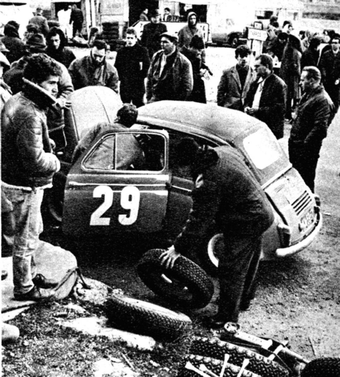Rajd Monte Carlo 1965, załoga: Sobiesław Zasada / Osiński Kazimierz - Steyr Puch 650 TR, prace serwisowe