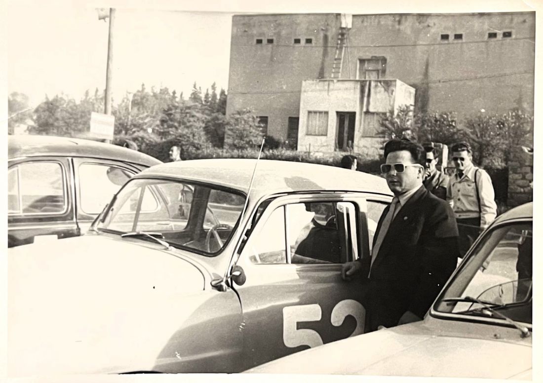 Rajd Acropolis 1958. Antoni Weiner przed swoją Simcą Aronde, nr startowy 52